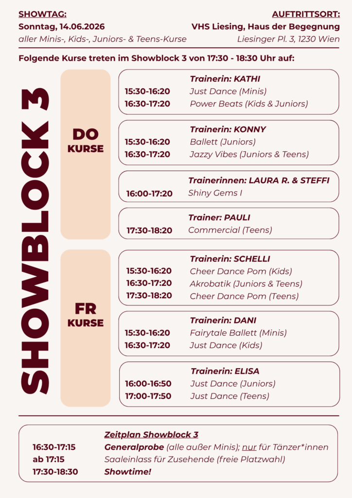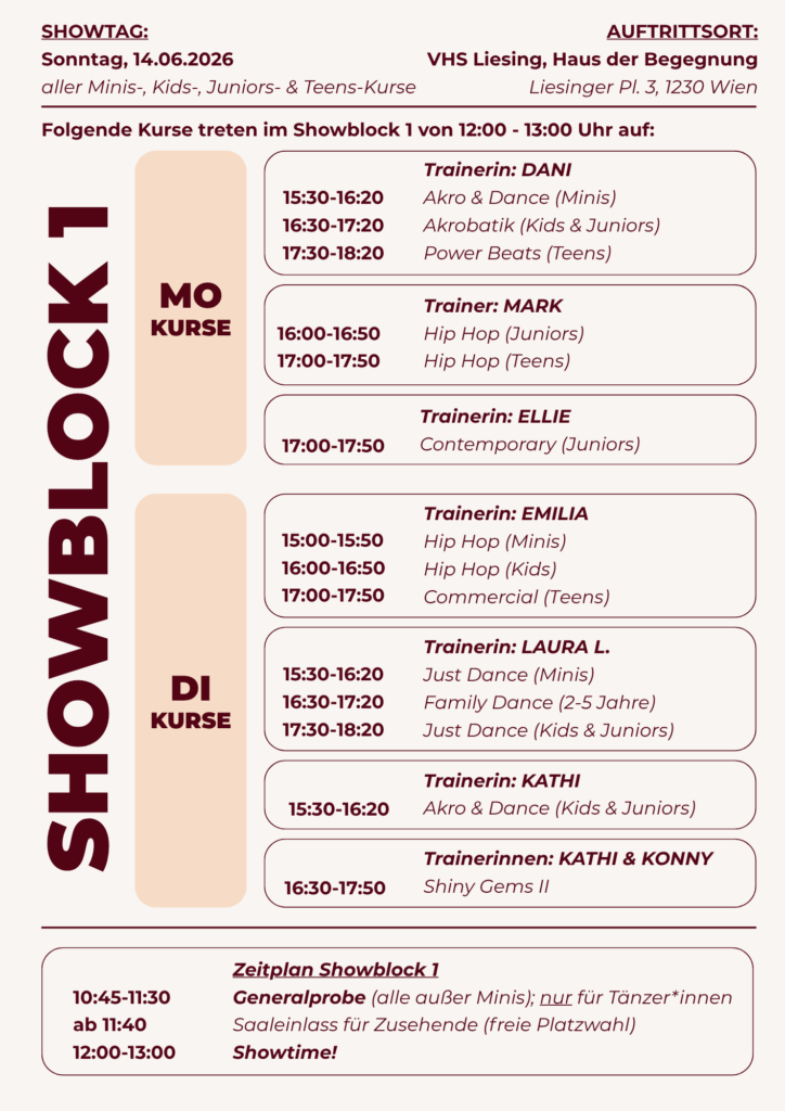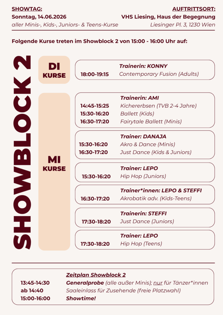Unsere Abschlussshow für alle Minis, Kids, Juniors und Teens Kurse findet heuer am Sonntag, 14.06.2026 in drei Blöcken in der VHS Liesing statt.